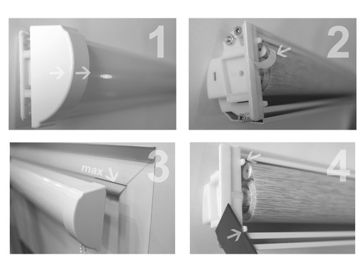 - Jeżeli po rozwinięciu tkaniny na całą wysokość szyby, pasy nie będą zachodzić na siebie (zdj.11), trzeba zdjąć osłony boczne i wyregulować położenie pasów pokrętłem regulacyjnym (zdj.12).