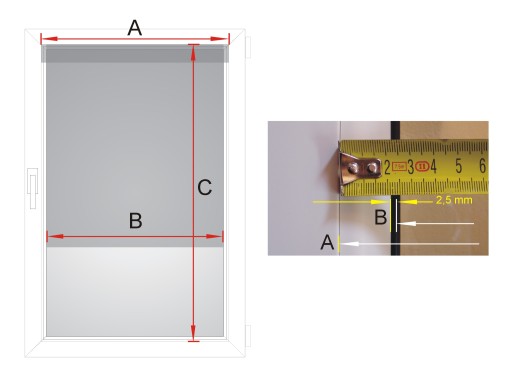 B: szerokość materiału czyli szerokość między listwami minus 0,5 cm (inaczej pisząc, jest to szerokość szyby plus gumowe uszczelki minus 0,5 cm aby materiał się nie kleszczył, różnica pomiędzy szerokościami powinna wyjść ok 4 cm, tej szerokości będzie materiał)