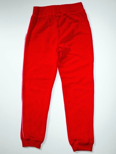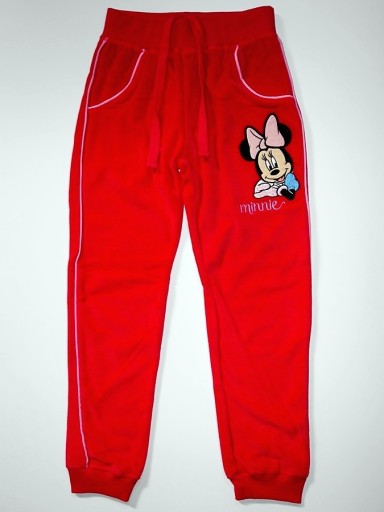 Spodnie dresowe dla dziewczynki w czerwonym kolorze, wykonane z wysokogatunkowej dzianiny dresowej. Aplikacja bajkowej Myszki Minnie nadaje spodniom oryginalności.