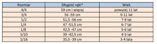 Dobierz odpowiedni rozmiar skrzypiec dla siebie, poniżej orientacyjna tabela.