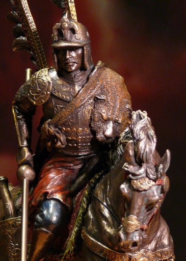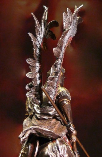 Rzeźba jest pokryta brązem, ręcznie malowana,