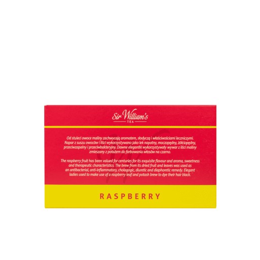 Herbata Sir Williams Tea Raspberry to doskonale aromatyczna kompozycja zwierająca naturalne wyciągi i kawałki owoców. Stworzona na bazie malin, dzikiej róży, jabłka oraz hibiskusa herbata stanowi idealne połączenie delikatnego smaku! Pyszny, soczysty smak uwalnia się już w kilka sekund po zaparzeniu i daje niesamowite wrażenia zapachowe.