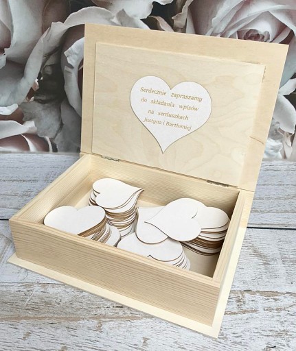 Wewnątrz na wieku naklejone seduszko lub ramka ( do wyboru) na który istnieje możliwość również personalizacji.
