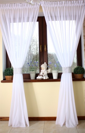 Przedmiotem sprzedaży biała firanka uszyta z tkaniny niewymagającej prasowania o wdzięcznej nazwie ,,Sable,, , spięta fantazyjną opaską ( opaski szyjemy z każdej tkaniny dostępnej w naszej ofercie ).