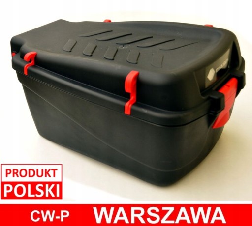 Kufer na bagażnik rowerowy z pokrywą na zawiasie i zatrzaskiem blokującym, wykonany z wytrzymałego tworzywa sztucznego