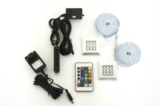 Polecamy OŚWIETLENIE LED SQUARE 4-punktowe 1 kolor biały zimny lub niebieski; RGB 16 kolorów z pilotem
