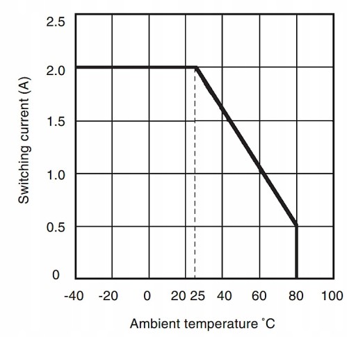 W przypadku pracy w temperaturze powyżej 25C obciążalność prądowa przekaźnika OMRON G3MB-202P jest niższa zgodnie z zamieszczonym wykresem. Po przekroczeniu 80C nastąpi nieodwracalne uszkodzenie przekaźnika SSR - najczęściej zwarcie lub rozwarcie na stałe.