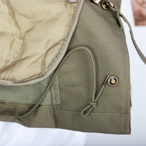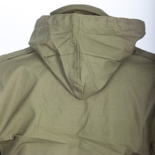 Kurtka posiada także dwie kieszenie na wysokości klatki piersiowej i dwie na wysokości bioder z zatrzaskami. Naturalnie nieodzownym elementem M-65 są pagony na ramionach zapinane na zatrzaski.