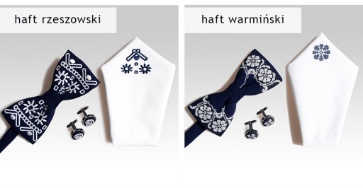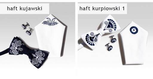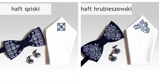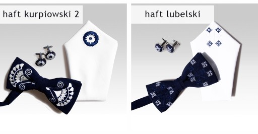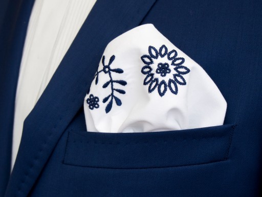 Mucha z poszetką i spinkami do mankietów w kolorze granatowym. Każdy element jest ozdobiony haftem ludowym, który pochodzi z tradycyjnych strojów ludowych z różnych regionów Polski. Delikatne ornamenty haftu przypominające technikę haftu na tiulu, haft krzyżykowy, haft płaski to tylko niektóre z wykorzystywanych technik hafciarskich.