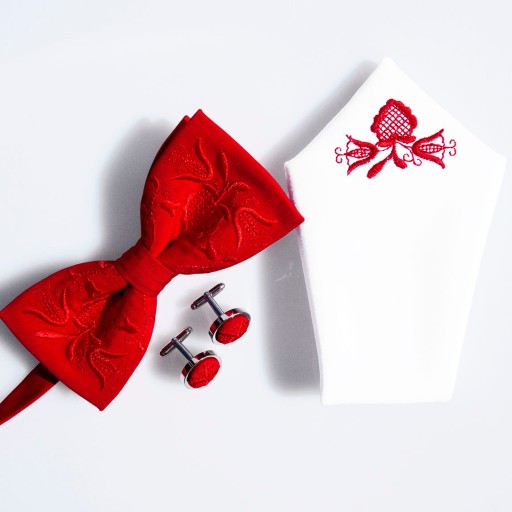 W skład zestawu wchodzą mucha, poszetka i spinki. Na innych aukcjach można te elementy kupić osobno. Ręczne wykonanie gwarantuje doskonałą jakość. Komplet jest zapakowany w eleganckie prezentowe pudełko. Mucha posiada regulowane zapięcie. Bazy spinek są wykonane z mosiądzu w srebrnym kolorze.