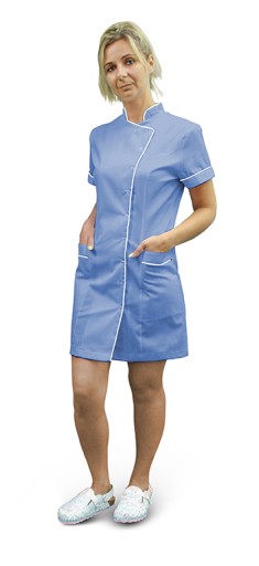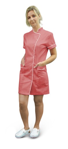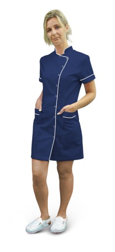 Fartuch zapinany jest na napy na całej jego długości, wykończony jest lamówką, zaś dekolt zwieńczony jest szykowną stójką.