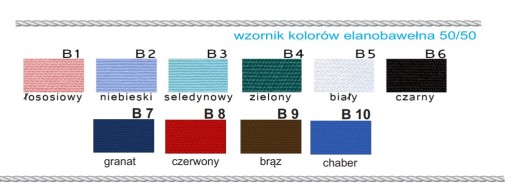 Kolory: Biały, Czarny , Zielony, Czerwony, Niebieski, Łosoś, Seledynowy, Fuksja, Szary, Granatowy, Chabrowy, Brązowy,