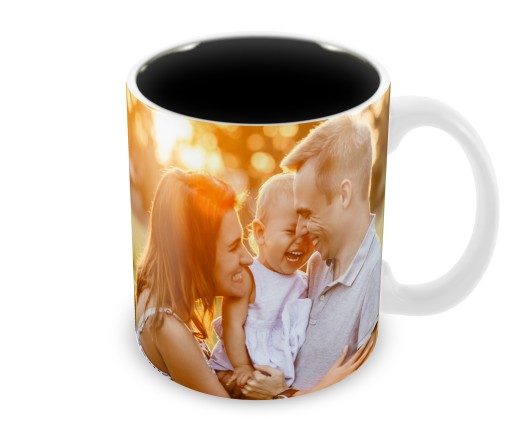 Foto kubek z dowolnym nadrukiem i czarnym wnętrzem.