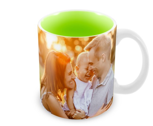 Foto kubek z dowolnym nadrukiem i zielonym wnętrzem.