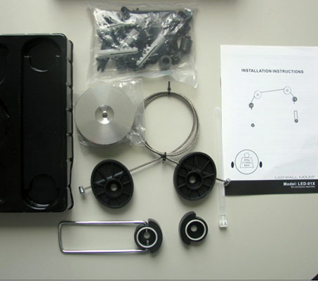 Wystarczy przykręcić do tylnej, górnej części telewizora, będącą na wyposażeniu wieszaka linkę stalową wraz z dwoma kółkami aluminiowymi z nacięciem o średnicy 40 mm. W dolnej, tylnej części telewizora przykręcamy dwa dystansowe kółka o średnicy 40 mm a do ściany przykręcamy dwa krążki stożkowe o średnicy 70 mm, na których zawieszamy telewizor jak obraz. Tak zawieszony telewizor można w łatwy sposób odchylić jedną ręką od ściany w celu podłączenia przewodów łączących z innymi urządzeniami.