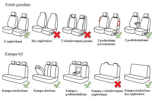- Pokrowce uniwersalne przeznaczone są na fotele standardowe z przodu i kanapą z tyłu. Nie są przystosowane na fotele kubełkowe i fotele pojedyncze w drugim rzędzie (opcje dostępne w pokrowcach miarowych w wybranych modelach samochodów).