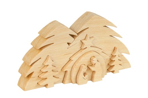 Poszczególne elementy stajenki wycięte w litym drewnie i złożone, niczym puzzle, w efektowną szopkę bożonarodzeniową. Ozdoba składa się z 7 elementów.