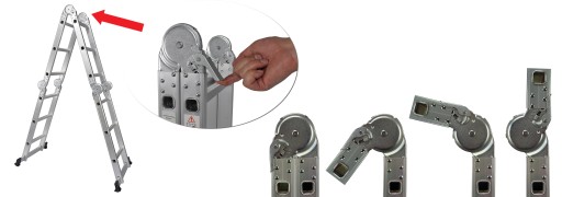 Aby rozstawić, rozłożyć całkowicie bądź złożyć drabinę, wystarczy odblokować oba zawiasy. Zawiasy blokują się automatycznie w wymaganej pozycji. Nie wymaga to użycia siły.