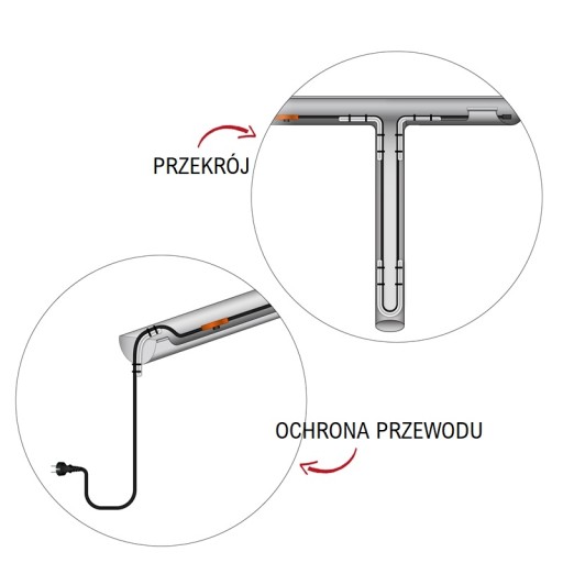Przewód grzewczy ma wbudowany energooszczędny termostat, który włącza się po spadku temperatury poniżej 3 ºC, a wyłącza przy temperaturze wynoszącej ok. 13 ºC. Nie wymaga przy tym nadzoru. Termostat należy umieścić na rurze w najchłodniejszym miejscu. Nie można go izolować.