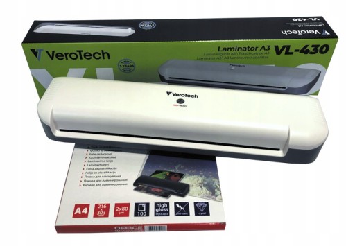 Laminator marki VeroTech to urządzenie przeznaczone do szybkiego laminowania na gorąco dokumentów w formacie A3 (także mniejszych). Sprzęt ten jest prosty w obsłudze, pracuje z prędkością 300 mm/min.
