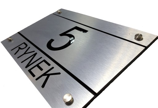 - Tabliczka wykonana jest z płyty kompozytowej (aluminiowej) typu dibond 3mm (srebro szczotkowane) oraz napisy/cyfry z czarnej (połysk) 3mm