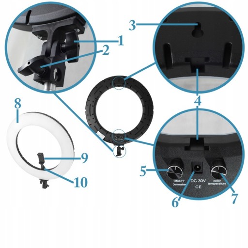 Łatwy montaż na statywie studyjnym ze standardową końcówką 16 mm umożliwia regulowane ramię z mocowaniem zaciskowym, zapewniając komfortową pracę z lampą. Wewnętrzna powierzchnia odbijająca pozwala na dużą wydajność świecenia, a kształt okręgu sprawia, że fotografowany obiekt oświetlony jest równomiernie ze wszystkich stron i nie trzeba dostarczać innych źródeł światła.