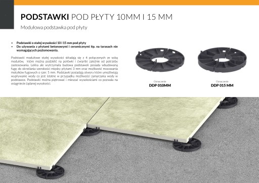 - Podstawki tarasowe stosuje się do podtrzymywania płyt tarasowych (zarówno drewnianych jak i kamiennych), na tarasach, których przeznaczeniem jest ruch pieszy.