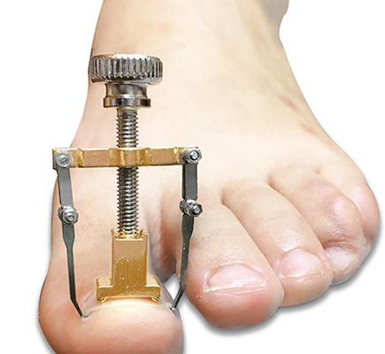 - Założyć klamrę na paznokieć zaczepiając boki wrośniętych paznokci hakami i dokręcić.