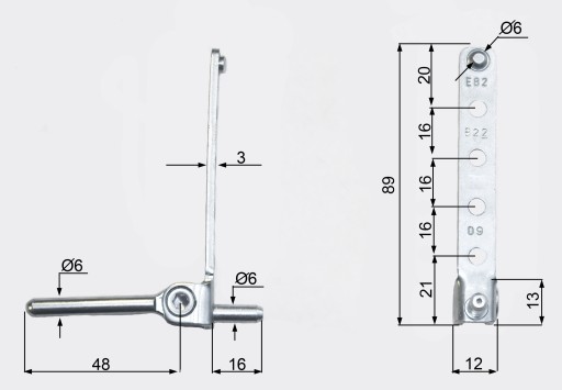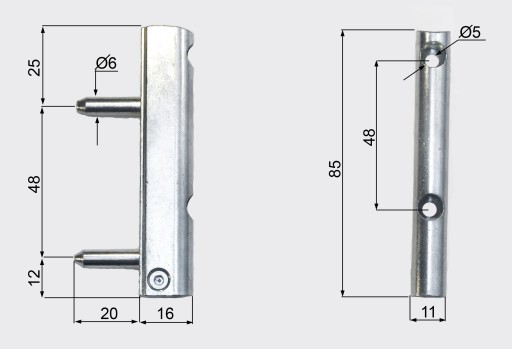 Opis: zawias wykonany jest z metalu ocynkowanego. Jest to zawias okienny dolny. Część dolna zawiasy przykręcana jest do ramy okna za pomocą 4 wkrętów a część górna zawiasy przykręcana jest do skrzydła okna za pomocą 2 wkrętów. Dodatkowo dolna część zawiasu posiada 2 bolce (dolny duży i górny mały) ustalające położenie zawiasu jak i przeciwdziałające opuszczaniu się zawiasu. Górna część zawiasu również posiada 2 bolce ustalające położenie zawiasu jak i przeciwdziałające obwieszaniu się skrzydła. Zawias tego typu jest stosowany najczęściej w oknach PVC. Zawias przeznaczony jest do skrzydła o maksymalnej wadze 100 kg. Zawias umożliwia regulację okna w poziomie (dolna część zawiasu) oraz w pionie (górna część zawiasu).