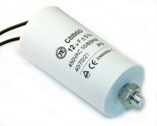 Kondensator rozruchowy 12uF 450V z przewodami do silników jednofazowych.