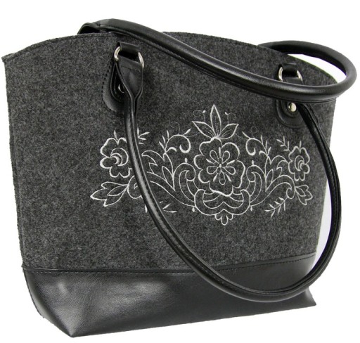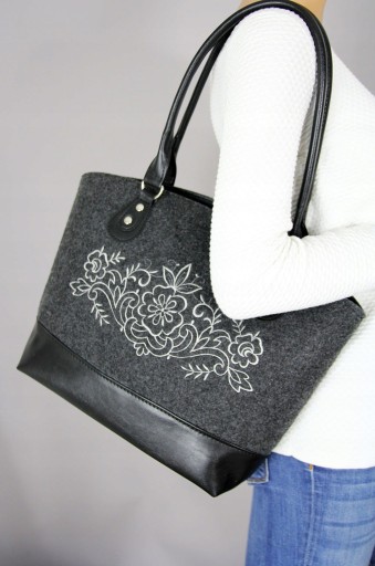 Torebka produkcji polskiej, wykonana z grubego filcu z elementami z eko-skóry. Bardzo pojemna i praktyczna, mieści duże teczki formatu A4. Zamykana na zamek błyskawiczny, w środku znajduje się kieszonka na telefon. Wnętrze torebki wykończone jest podszewką. Z tyłu torebki dodatkowa kieszonka zamykana na suwak.