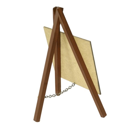 Stelarz tabliczki ma wygląd mini sztalugi i wykonany jest z naturalnego drewna pomalowanego na kolor brązowy.