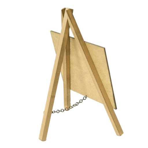 Stelarz tabliczki ma wygląd mini sztalugi i wykonany jest z naturalnego drewna pomalowanego na kolor brązowy.