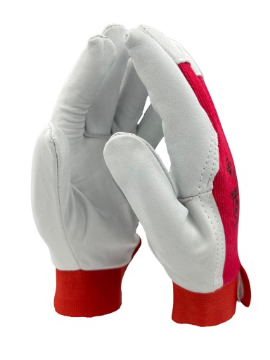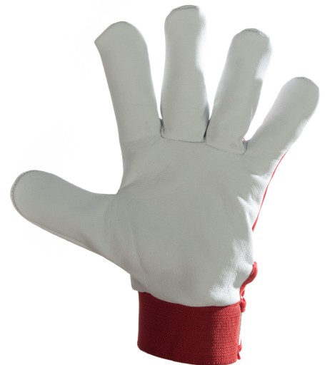 Rękawice ochronne wykonane z wysokiej jakości skóry koziej, z dzianiną w kolorze czerwonym PSWRED 9-10.