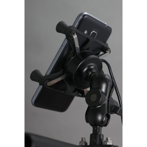 Uchwyt wyposażony jest w gniazdo usb z wyprowadzonym przewodem do podpięcia pod akumulator.