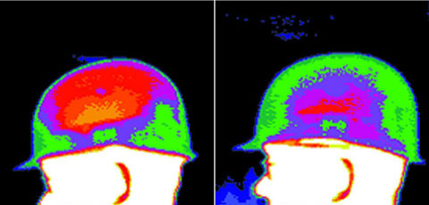 Zdjęcie w podczerwieni przedstawia zalety hełmu z seryjną wentylacją (po prawej). Temperatura spada o 2 do 3 stopni, a wilgotność powietrza zmniejsza się 50 procent.