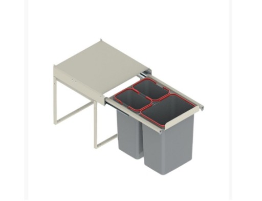 Wysuwane pojemniki z centralnym przykryciem są umieszczone w mechanizmie z metalową prowadnicą pełnego wysuwu i cichym domykiem, dzięki której kosz przesuwa się lekko i precyzyjnie. Podczas otwierania przykrycie zostaje w środku szafki.