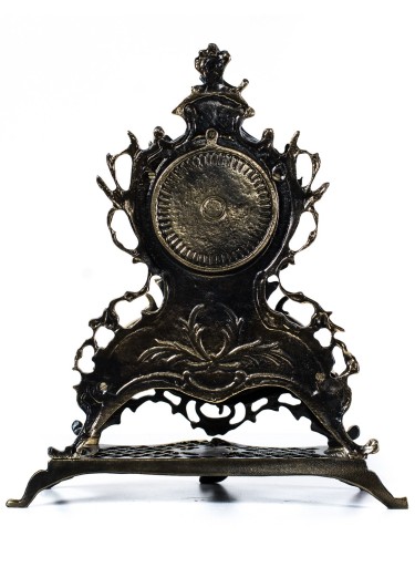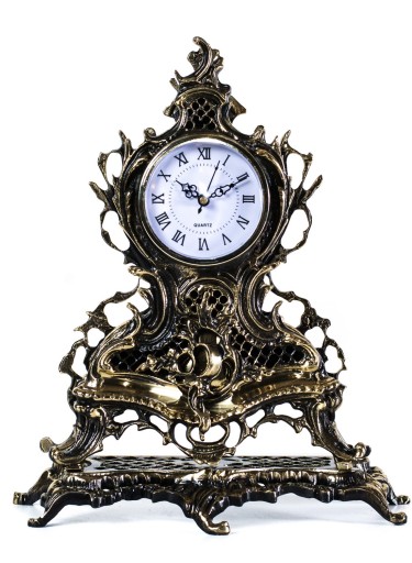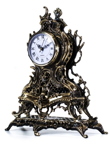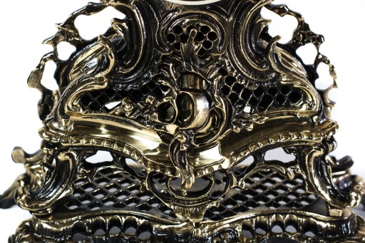 Przedstawiamy zegar wykonany z mosiądzu przez polskich rzemieślników. Jest to jeden z najładniejszych, najbardziej okazałych zegarów kominkowych już z zabudowaną tylną ścianką. Bogato zdobiony front z misternie wykończonymi elementami, efektownie harmonizuje z ażurową podstawą. Zegar utrzymany w antycznym charakterze, przepolerowany w miejscach eksponowanych, ciemniejszy w zakamarkach, cyferki rzymskie czarne na białym tle. Tarcza zegara wraz ze wskazówkami zabezpieczona szybką. Precyzyjny odlew z doskonale wyeksponowanymi detalami. Klasyczny mechanizm kwarcowy zasilany jedną bateryjką R6 - paluszek. Mosiężny zegarek został pokryty lakierem zapobiegającym utlenianiu się mosiądzu.