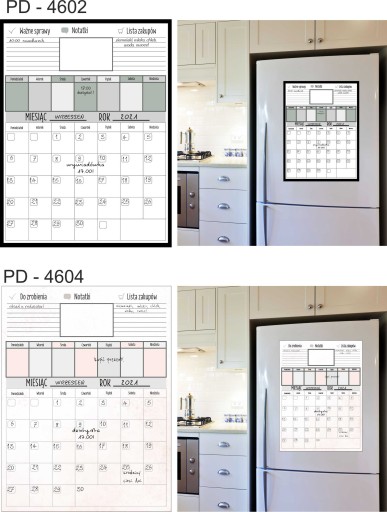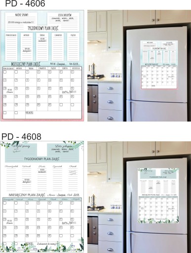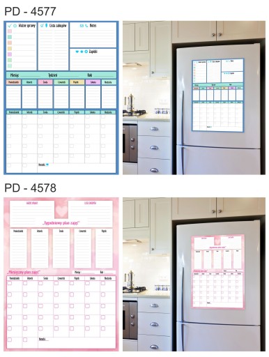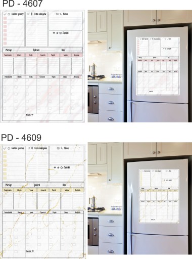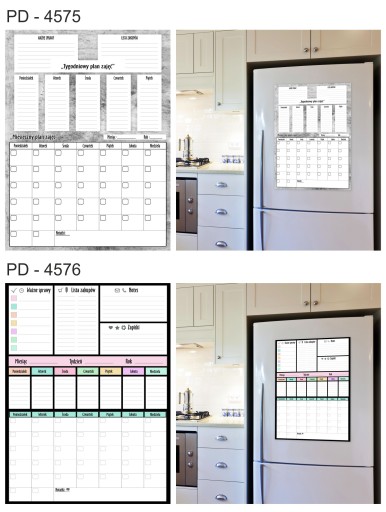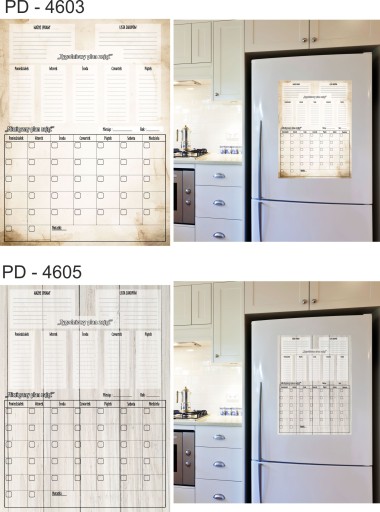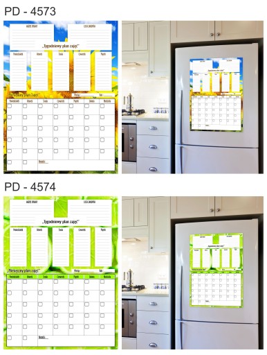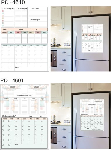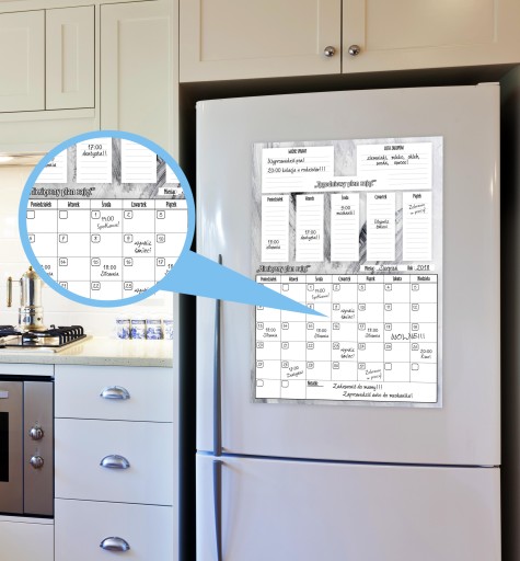 Tablica Planer magnetyczny na lodówkę ( zmywalna), jest pokryta laminatem, który zabezpiecza wydruk przed uszkodzeniami. Jednocześnie pozwala bez obawy pisać markerami suchościeralnymi lub kredowymi oraz ścierać napisy .