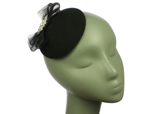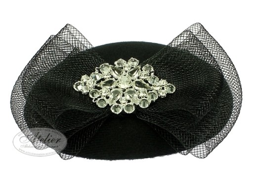 Toczek wykonany jest z filcu syntetycznego, ozdobiony kokardą crin ze szlifowanymi kryształami i cyrkoniami w posrebrzanej oprawie.