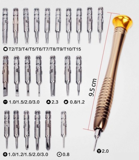 - Zestaw składający się z 24 końcówek oraz bardzo wygodnej wyprofilowanej rączki, co tworzy komplet umożliwiający serwisowanie oraz naprawę większości drobnych urządzeń elektronicznych GSM, AGD, RTV
