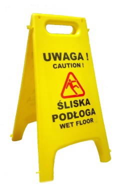 Tablica informacyjna, niezbędna w przypadku sprzątania na mokro w obiektach użyteczności publicznej lub w przypadku złych warunków pogodowych, ostrzegająca przed przypadkowym poślizgnięciem.