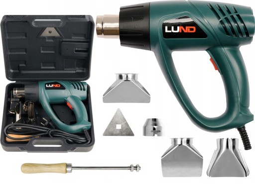 Opalarka marki LUND z wyposażeniem, do usuwania powłok malarskich i lakierniczych, formowania i obkurczania przy pomocy gorącego powietrza. Nadaje się również do lutowania i zgrzewania.