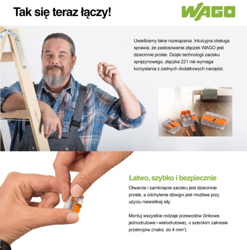 Dzięki nowym złączkom instalacyjnym, przeznaczonym do instalacji elektrycznej, nawet na niewielkiej przestrzeni możliwy jest szybki i bezpieczny montaż przewodów jednodrutowych, linkowych i wielodrutowych w puszkach instalacyjnych: zapewniają to mniejsze o 40% wymiary, w porównaniu do serii 222, przezroczysta obudowa, prostsza obsługa oraz dwa otwory pomiarowe.