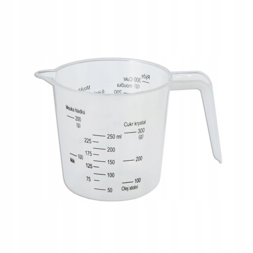 Miarka z uchwytem i wylewką. Posiada miarki odpowiednie dla cieczy, cukru, mąki, oleju, maku, ryżu.