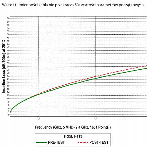 Przewód koncentryczny 75 Om TRISET-113 spełnia normę EN50117 i jest zgodny ze standardem klasy A w całym paśmie transmisyjnym w przedziale częstotliwości 5 - 3000 MHz.