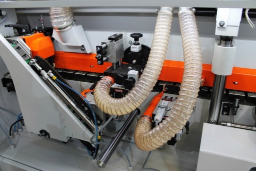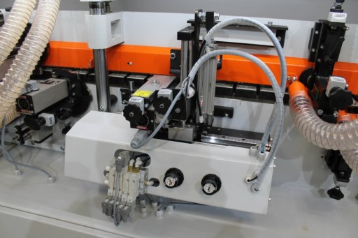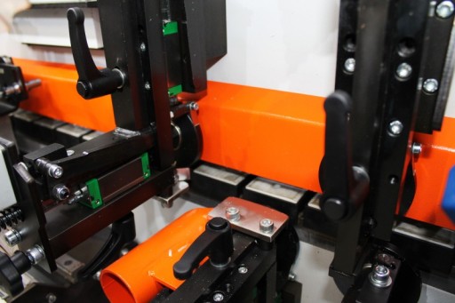 - 2 oddzielne piłki do obcinania początek-koniec okleiny (fi 110 x fi 32 Z=30 zębów) mocowane na prowadnicach REXROT