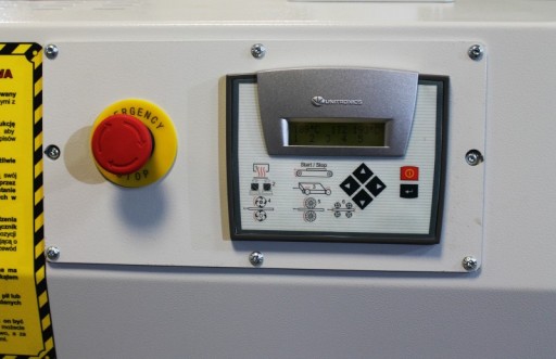 - Panel kontrolny PLC (unitronics) z przodu maszyny.
