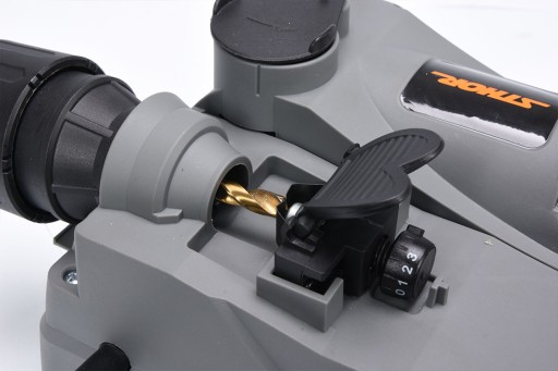 Przed rozpoczęciem ostrzenia wiertła należy je zamocować w uchwycie w odpowiedni sposób. W tym celu należy nacisnąć zatrzask szczęk co spowoduje ich rozchylenie (III). Pokrętłem uchwytu ustawić średnicę nieco większą od średnicy ostrzonego wiertła tak, żeby zapewnić swobodny ruch wiertła w uchwycie. Uchwyt wprowadzić w gniazdo pozycjonowania wiertła (IV). Należy zwrócić uwagę, że uchwyt wiertła posiada wypusty, które należy wprowadzić w nacięcia gniazda (V). Podnieść zatrzask szczęk, co spowoduje uchwycenie wiertła, należy tak obrócić wiertło, aby zostało uchwycone w najwęższym miejscu (VI).
