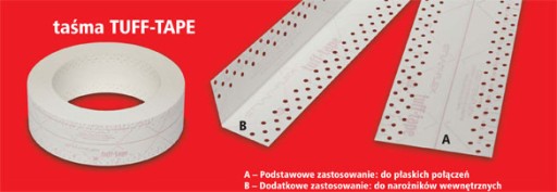 Taśmę TUFF-TAPE stosuje się do łączeń płytkartonowo-gipsowych na płaskich powierzchniach (takich jak sufit czy ściany) w miejsce siatki, fizeliny, taśmy papierowej, taśmy papierowej z wkładką aluminiową oraz do wykańczania rogów wewnętrznych.